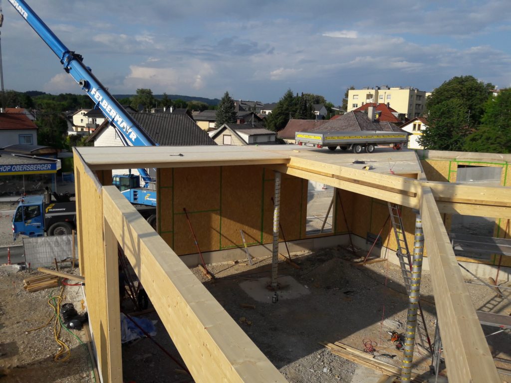 Auch die Fassade schaute von außen im November schon recht fertig aus, und der Außenputz des gemauerten Bereich musste noch erledigt werden. Doch die Hauptarbeit war im Inneren des Gebäudes. Die Solaranlage auf dem Dach an das Stromnetz anschließen, die Wärmepumpen auf dem Dach ins Laufen bringen bzw. generell Heizung, Strom, Stiegenhaus, Böden, IT, Innenausbau, Tischlerarbeiten, etc., all das waren große Brocken auf der ToDo-Liste.